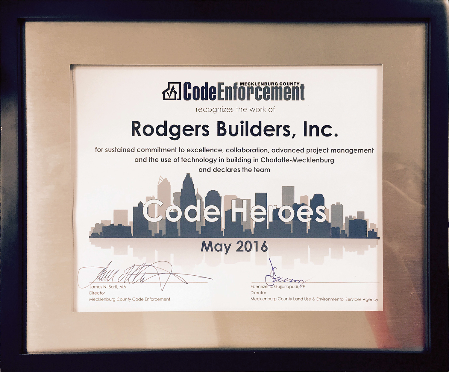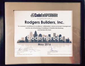 Mecklenburg County’s LUESA Code Enforcement division named Rodgers one of their 2016 Code Heroes on May 17, during Building Safety Month. The award recognizes organizations and individuals “whose work promotes and protects the safety of our community’s citizens in the built environment.” We’re proud of all our Rodgers team members for their commitment to building safety.
