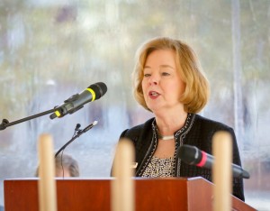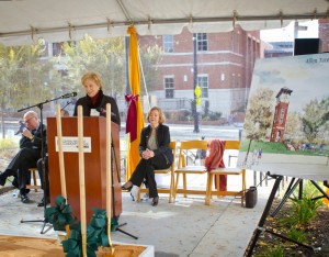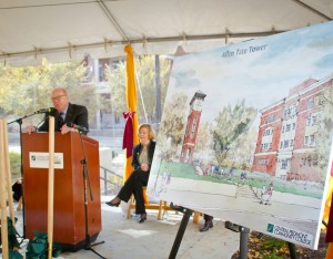 Dr. Tony Zeiss, CPCC President, states the Allen Tate Tower, constructed of brick and cast stone and featuring a four-sided clock face approximately six feet in diameter, will serve as a landmark for the college. Construction will be completed in early 2015.