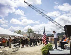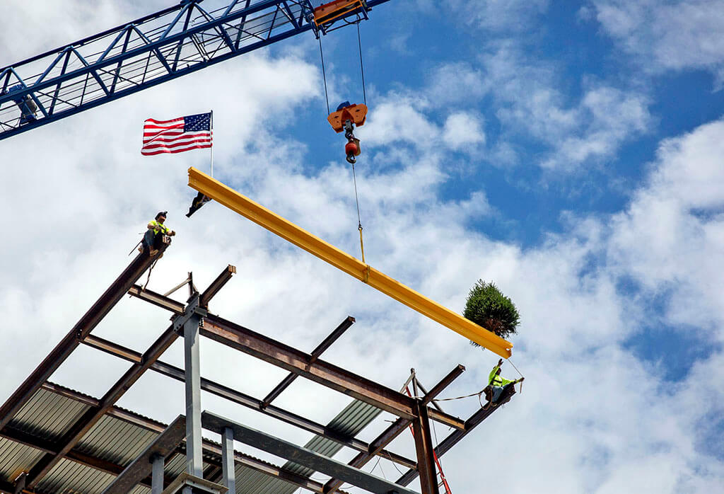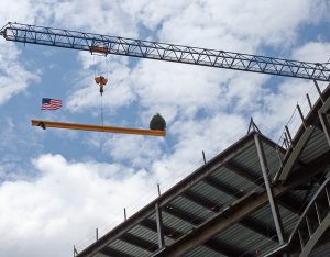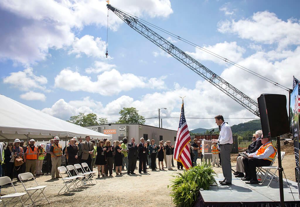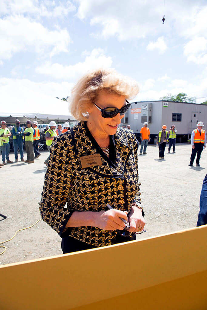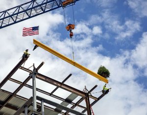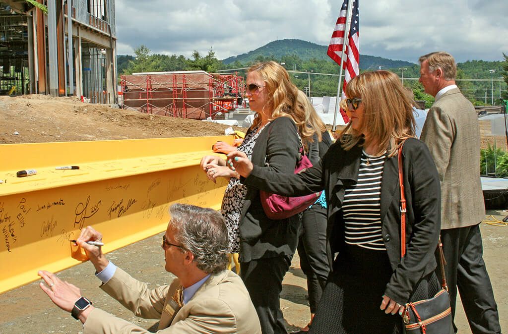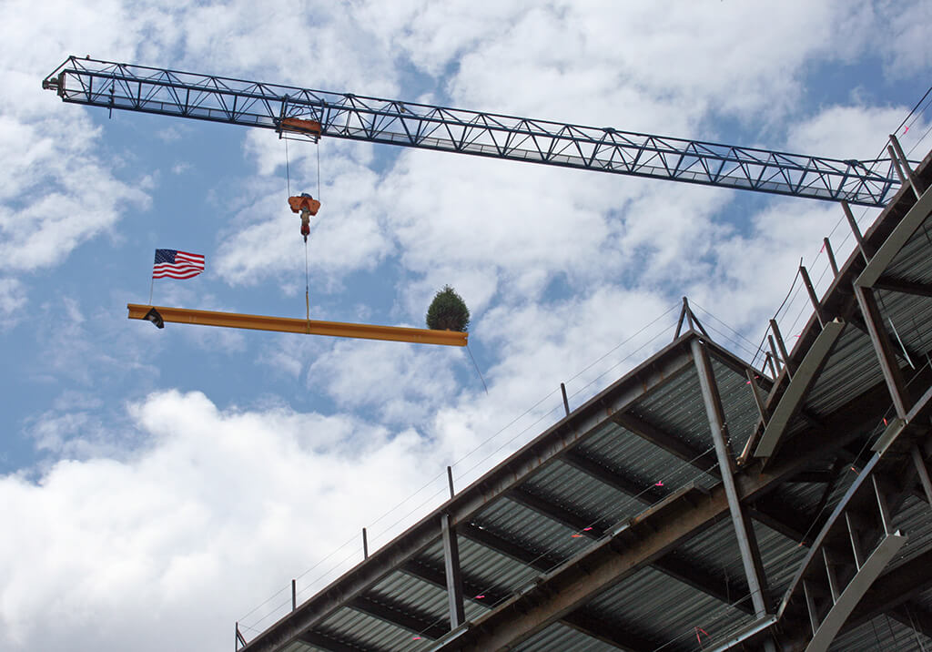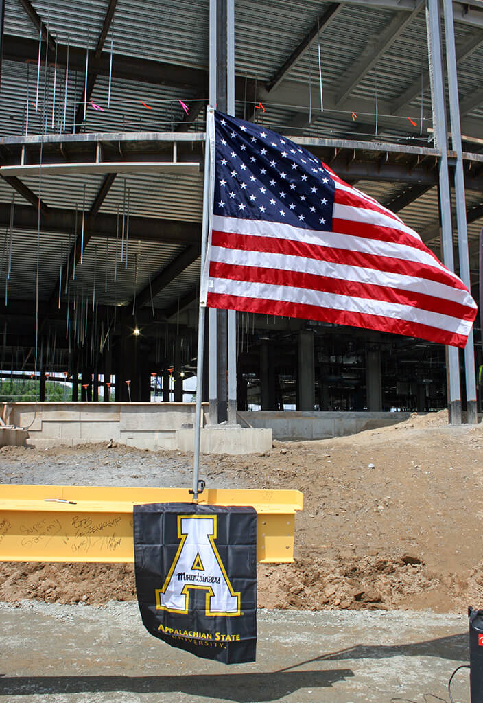 Subcontractors and craftworkers were applauded at Appalachian State University during a traditional topping out ceremony for the new building to house the Beaver College of Health Sciences. Guests watched as the final piece of steel structure was raised, bearing an American flag and evergreen tree, to mark completion of the steel infrastructure and to honor the craftworkers’ hard work and dedication to safety.