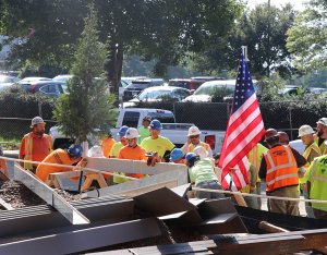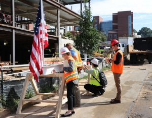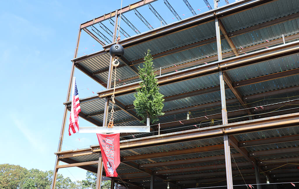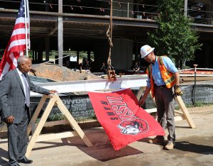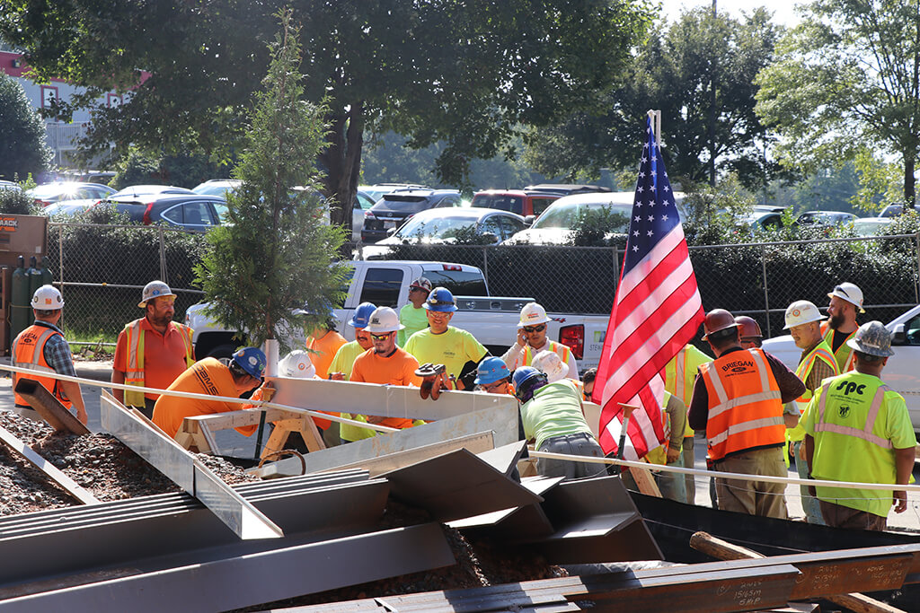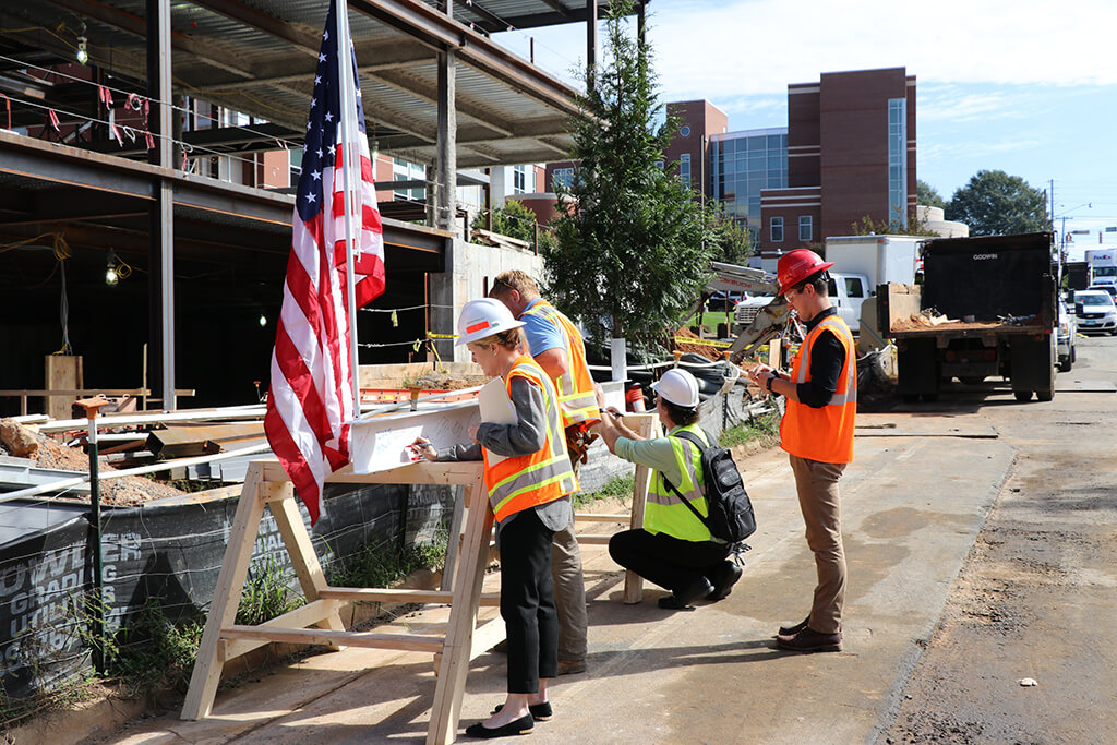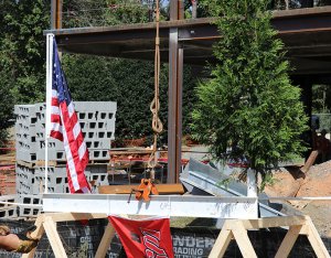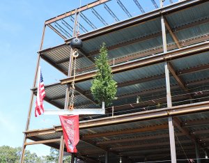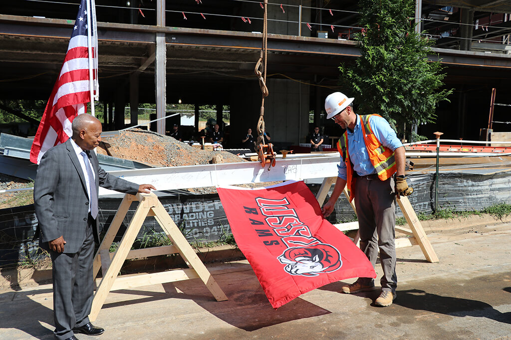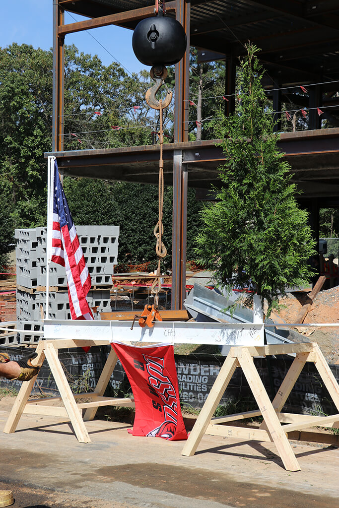 Per tradition, the ceremonial beam was painted white, signed by the project team and craftworkers and was hoisted to the top of the building along with a WSSU flag, an evergreen and the American flag. Legend has it that centuries ago, builders would hoist an evergreen tree to the topmost point of a structure to signal that a celebration was about to begin. For RodgersDavis, the evergreen represents the official celebration of safely reaching the tallest point of the building’s construction.