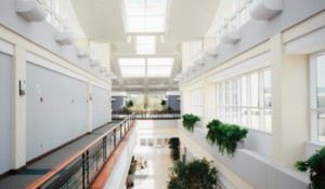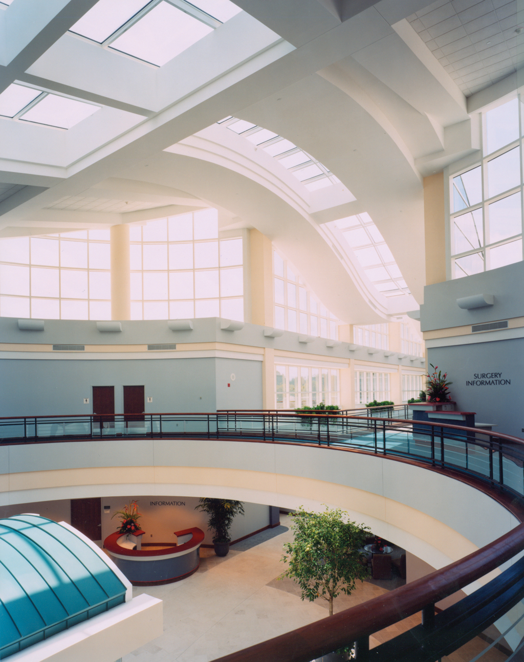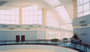 Outpatient services are located off a 30-foot-wide corridor; easily recognized by the wave-shaped, glass roofline that slides through the center axis of the main hospital complex