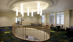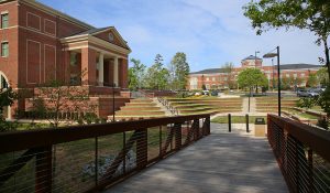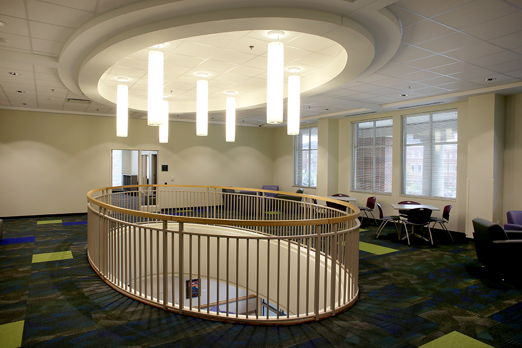 Outside, a 150-foot-long, 82,000-pound, steel pedestrian bridge connects the new parking area to the main part of campus
