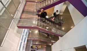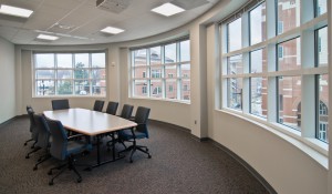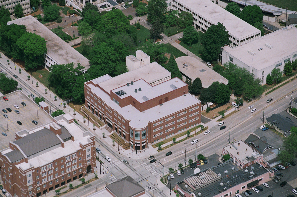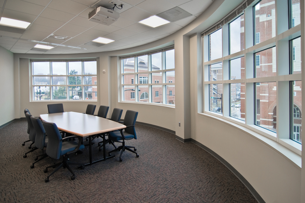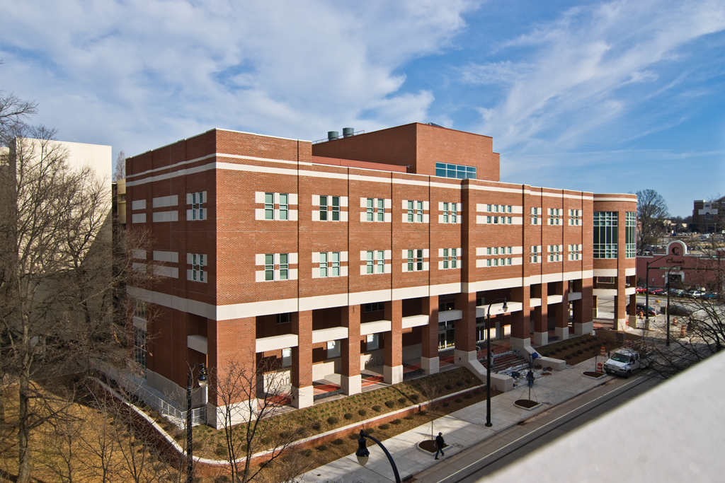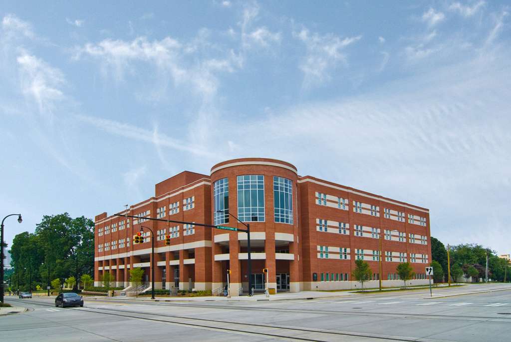 Construction of a new four-story addition with a masonry veneer and precast accents. It connects to the Belk Building, which received the bulk of the renovations. The entrance is distinguished by 21-foot-tall glass windows that are integrated within the design of the rotunda