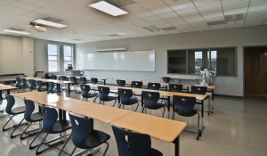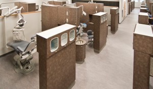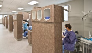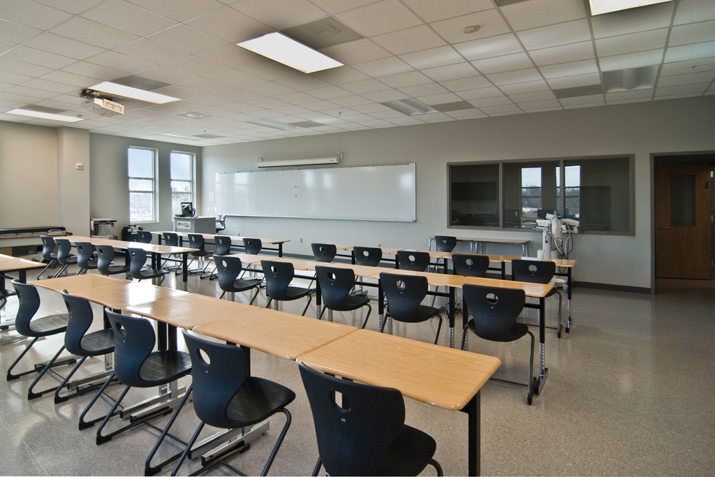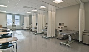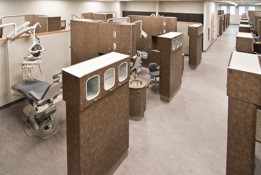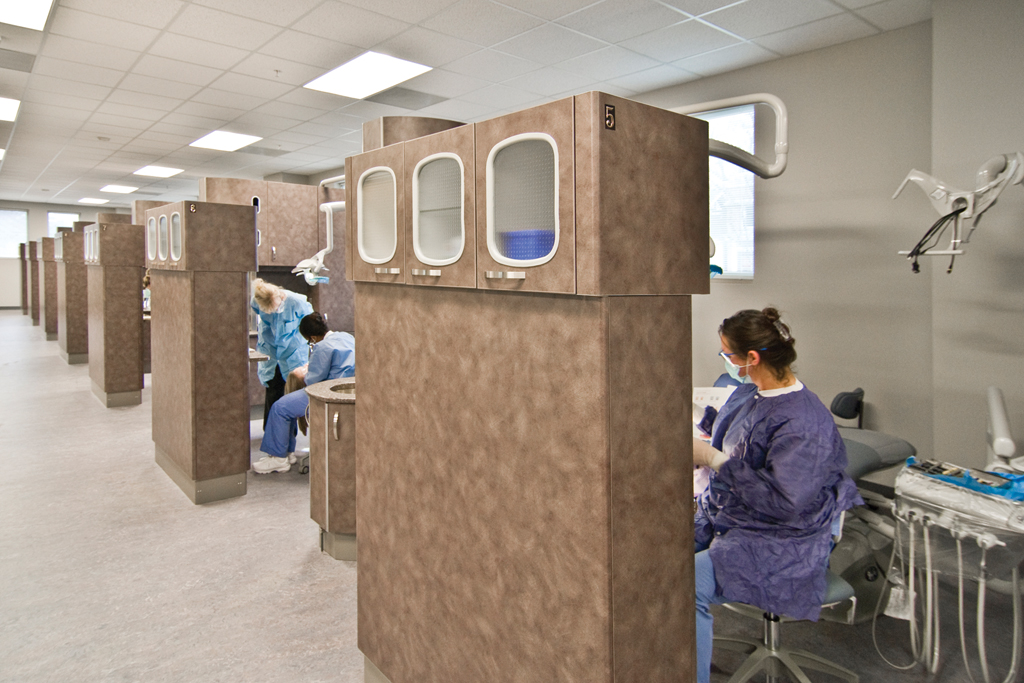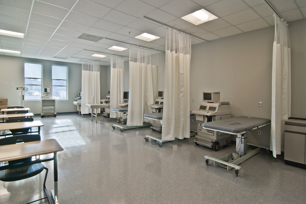 Interconnected buildings house classrooms and laboratories for students studying for medical support careers such as dental hygienists, respiratory therapists, and surgical technicians