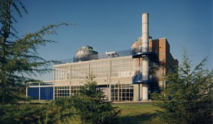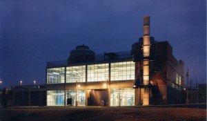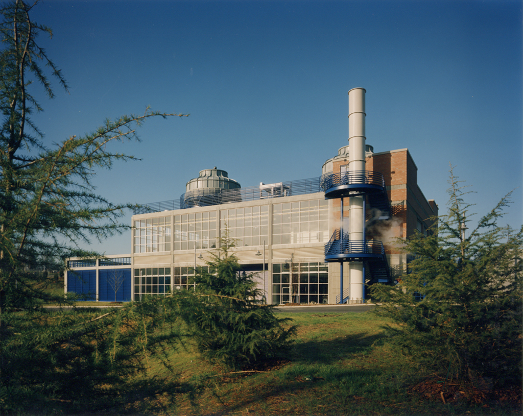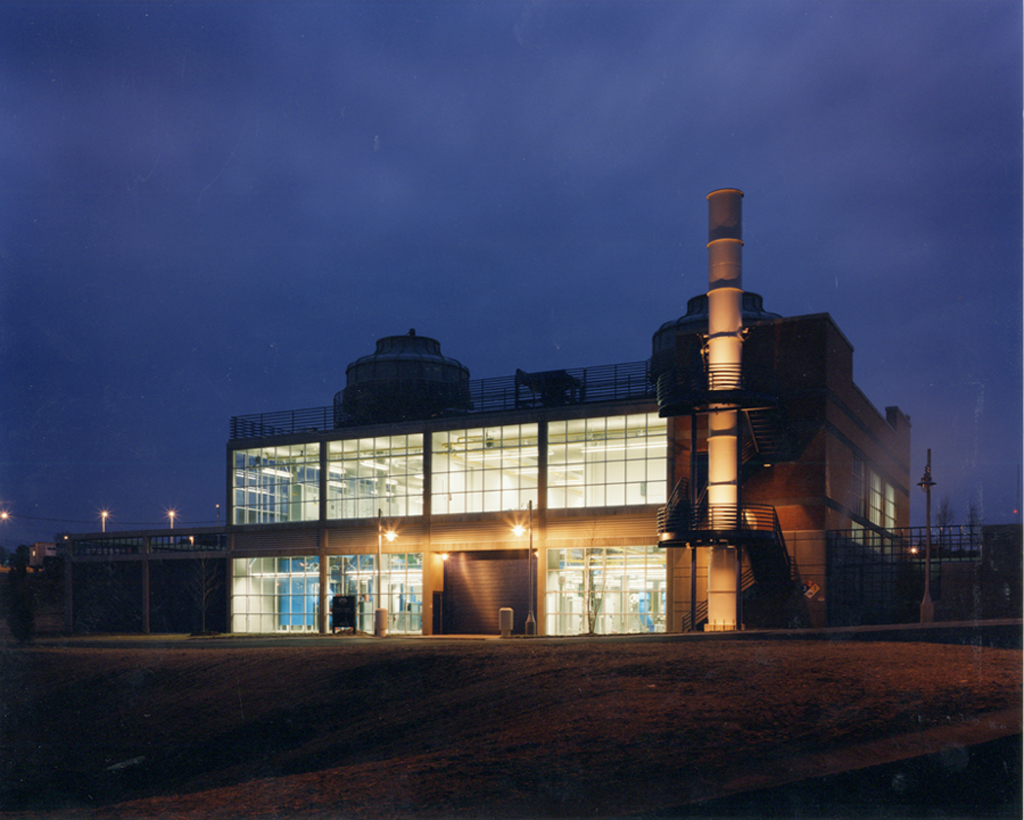 The two-story, unmanned Energy Center is a cast-in-place concrete structure, located adjacent to an oxygen tank compound, with an EPDM roof system. The lower level contains four boilers, four chillers, and two standby 4150 KVA generators. The second level includes a control room, electrical switchgear room, and maintenance shop. The roof level supports four cooling towers