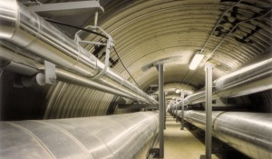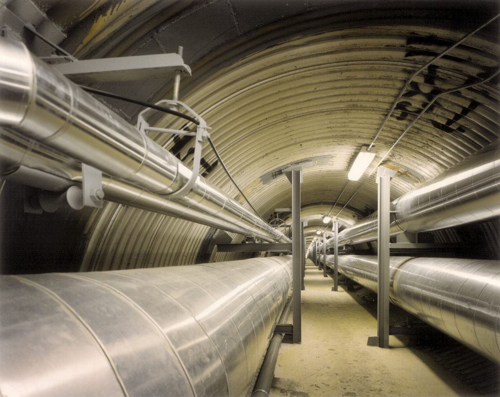 The utility tunnel has a 10-foot diameter and extends 800 feet. It carries steam, chilled water supply and return, oxygen, and power and control communications from the Energy Center to the main hospital