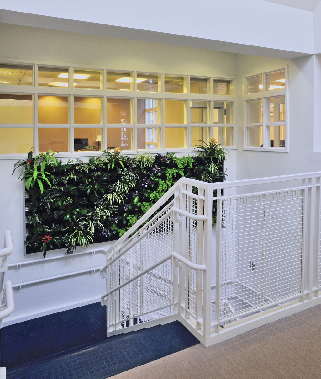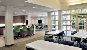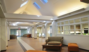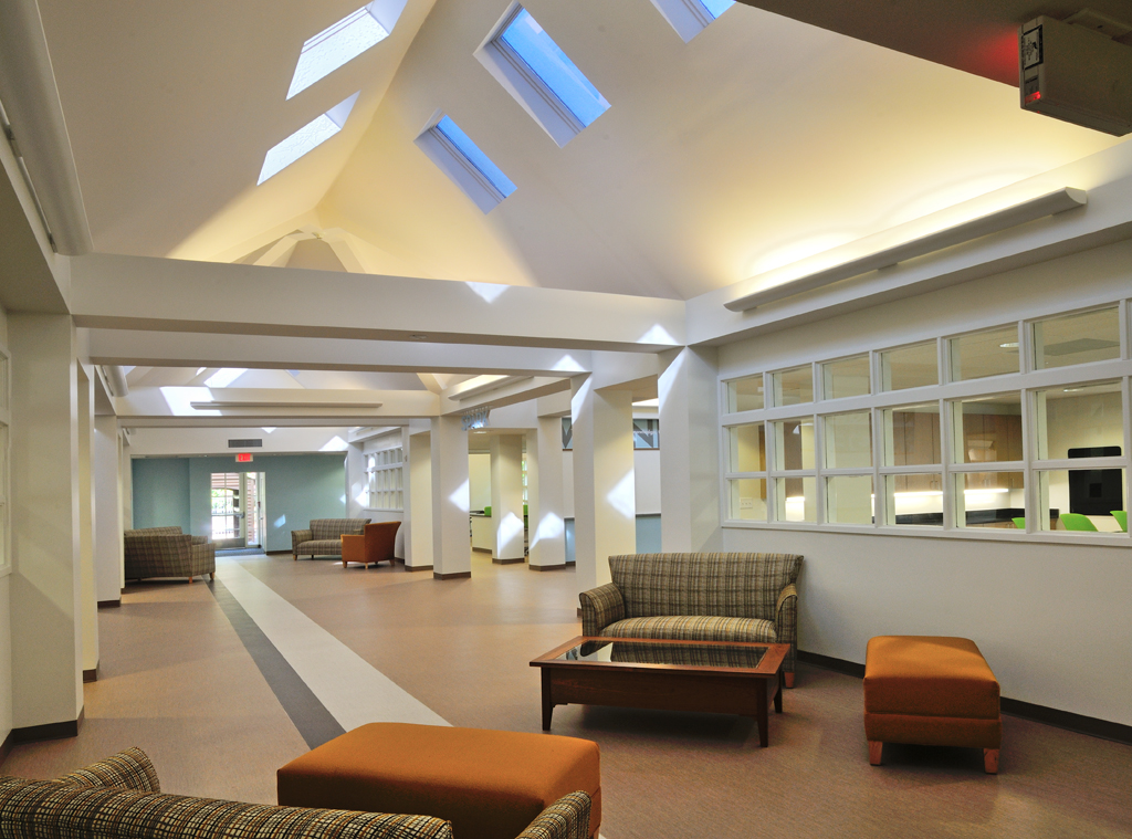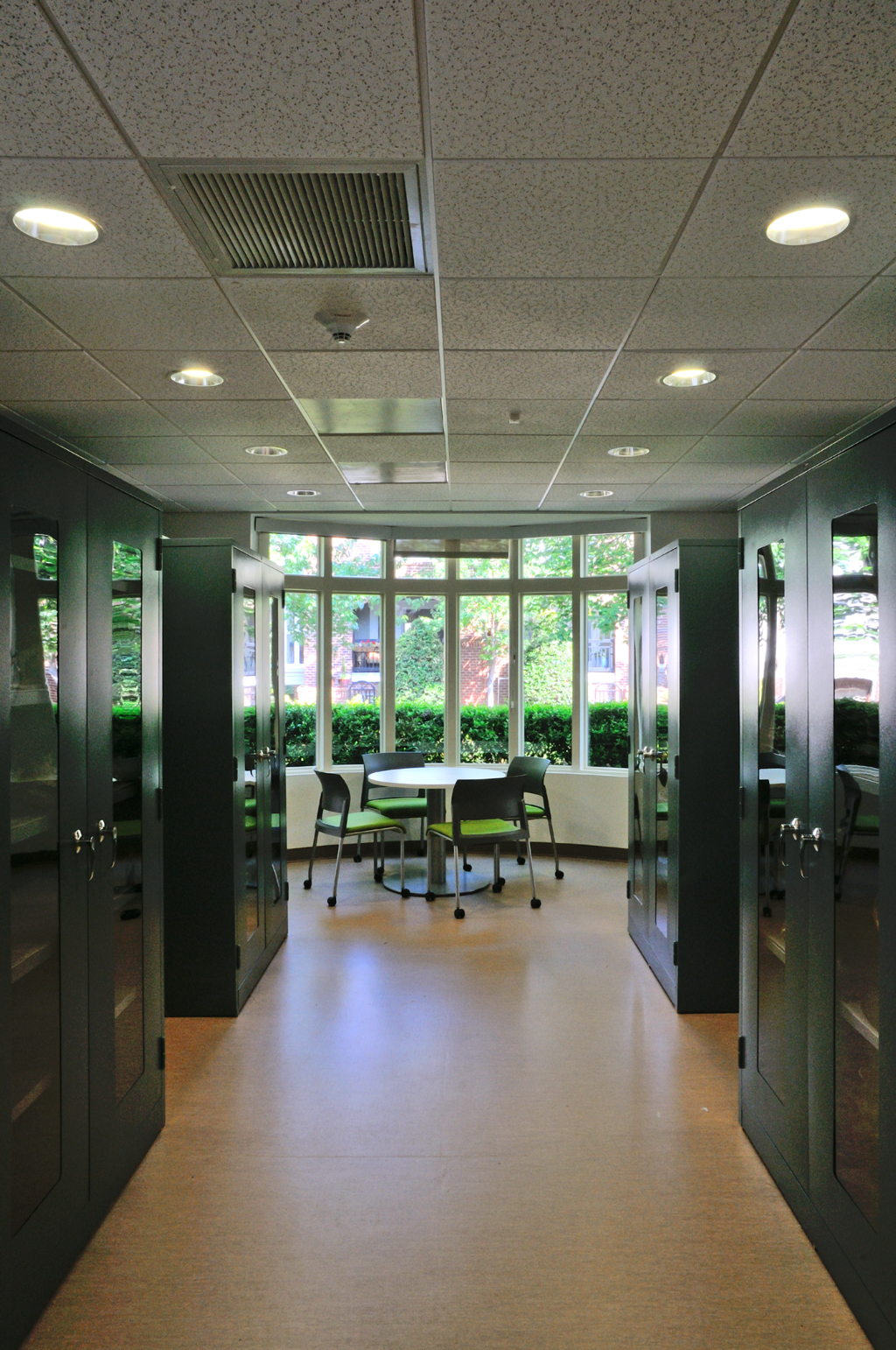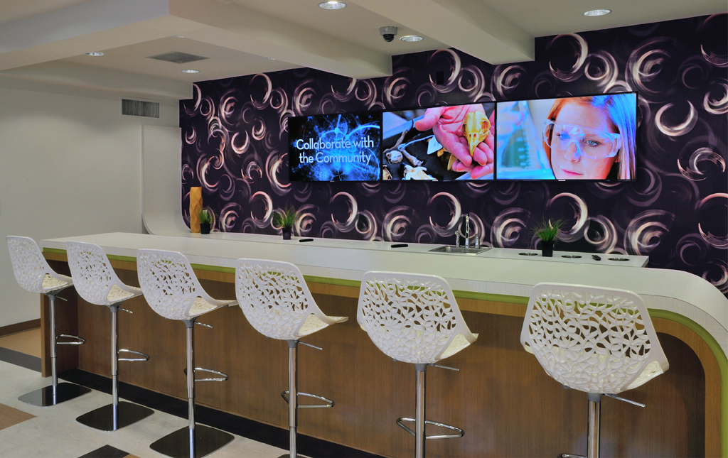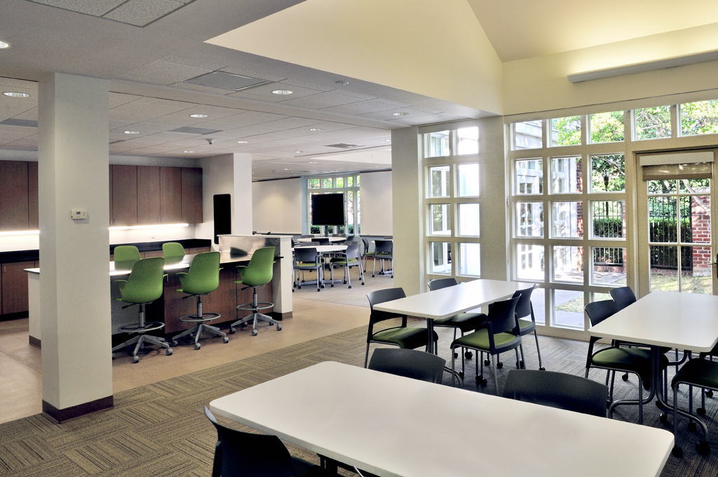 Project scope includes the demolition of existing walls and finishes, reworking of new bathrooms, concrete fill over monumental stairs to provide a new reception area, all new finishes, lab casework, glass storefront systems, operable partitions to provide flexible use of space, new plumbing and electrical fixtures and rework of MEP systems to accommodate the new layout