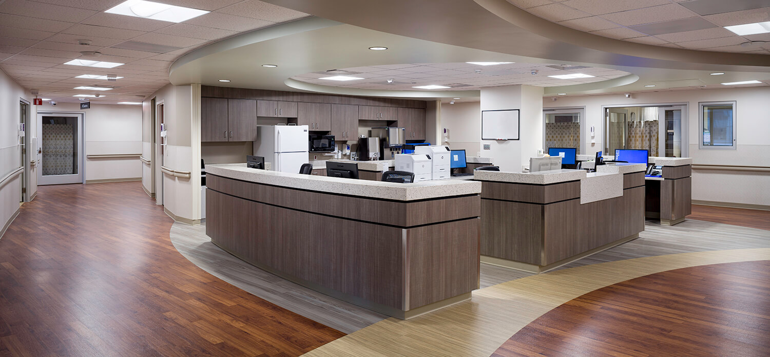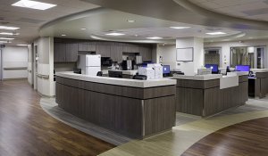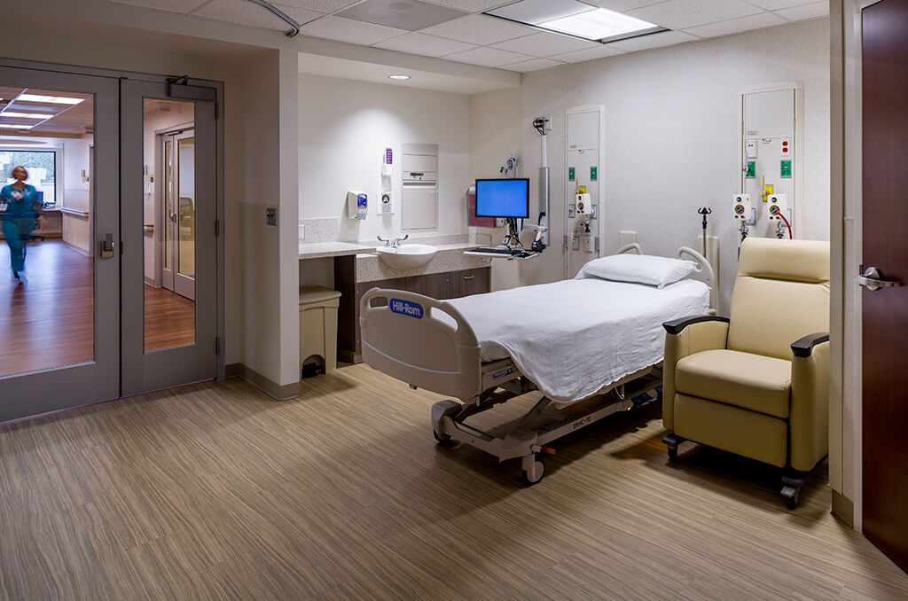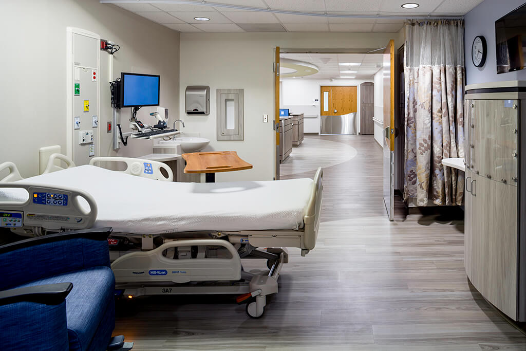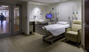 Patient rooms incorporate design standards such as nurse servers, patient fall minimization, and clinical and family room space coordination