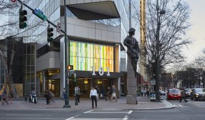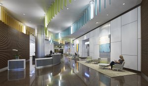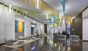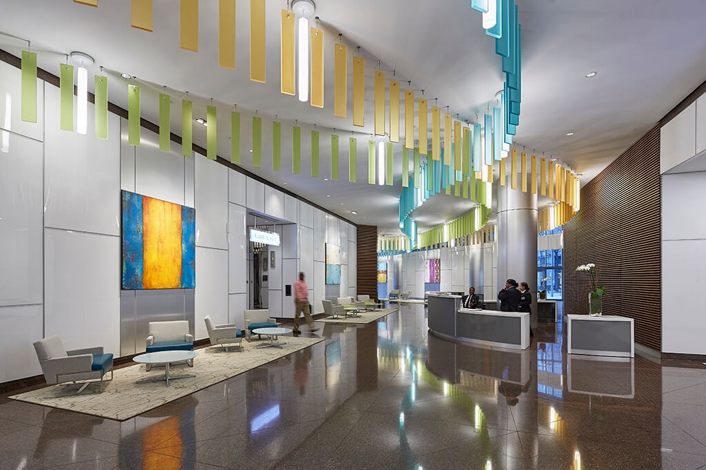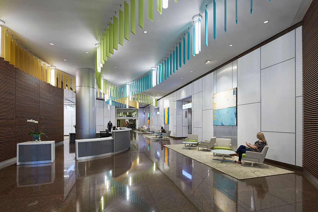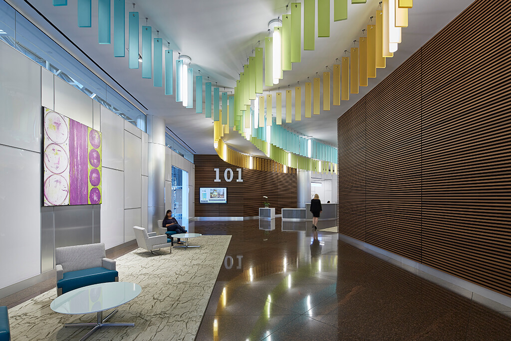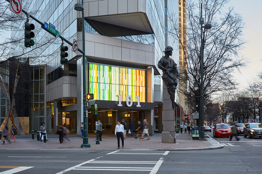 The lobby of 101 North Tryon underwent a renovation to create a more approachable and engaging pedestrian environment
