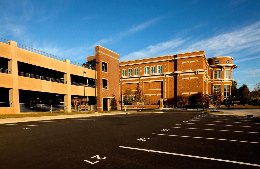 Precast parking deck has 290 spaces and brick accents on its stair tower, which replicate the design pattern of the main building
