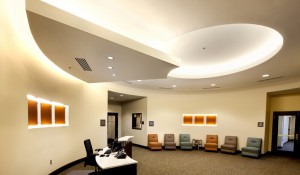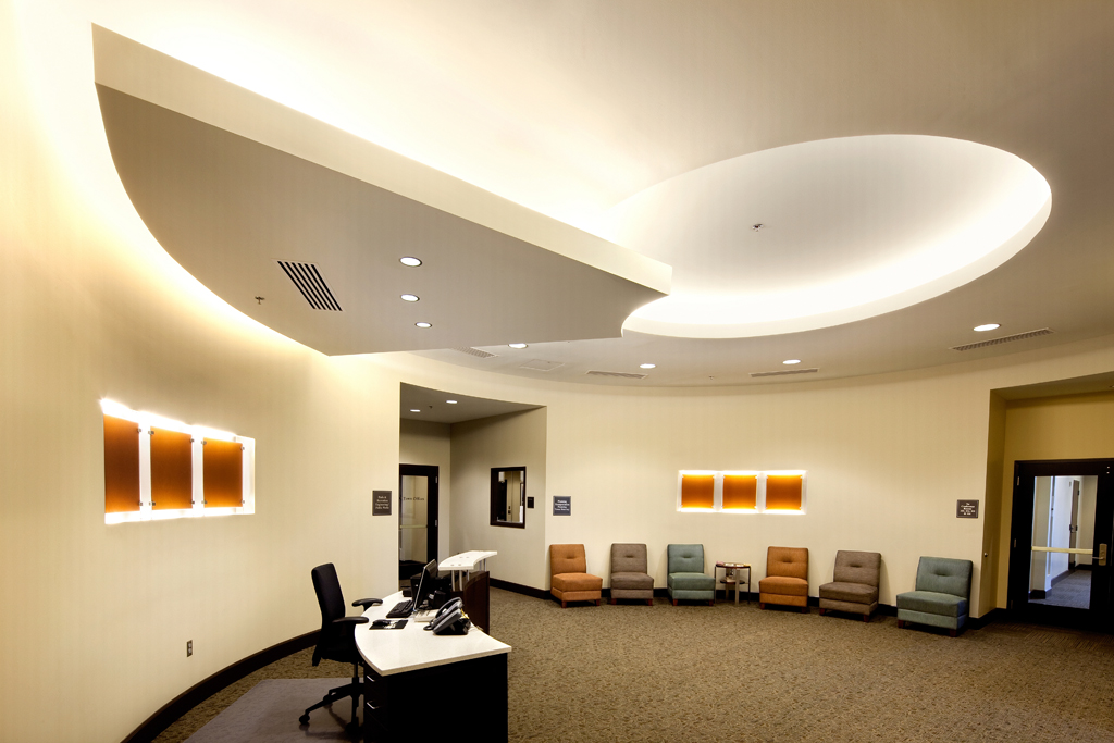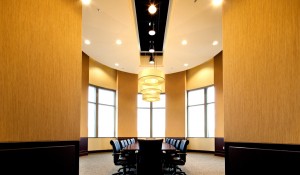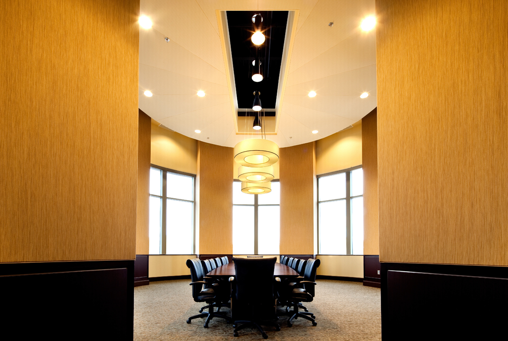 Finishes include a fabric wall system, custom millwork, specialty light fixtures, interior metal panels, and a wheel-chair lift
