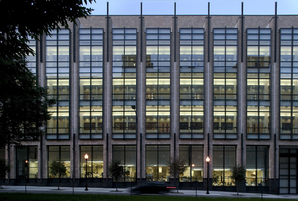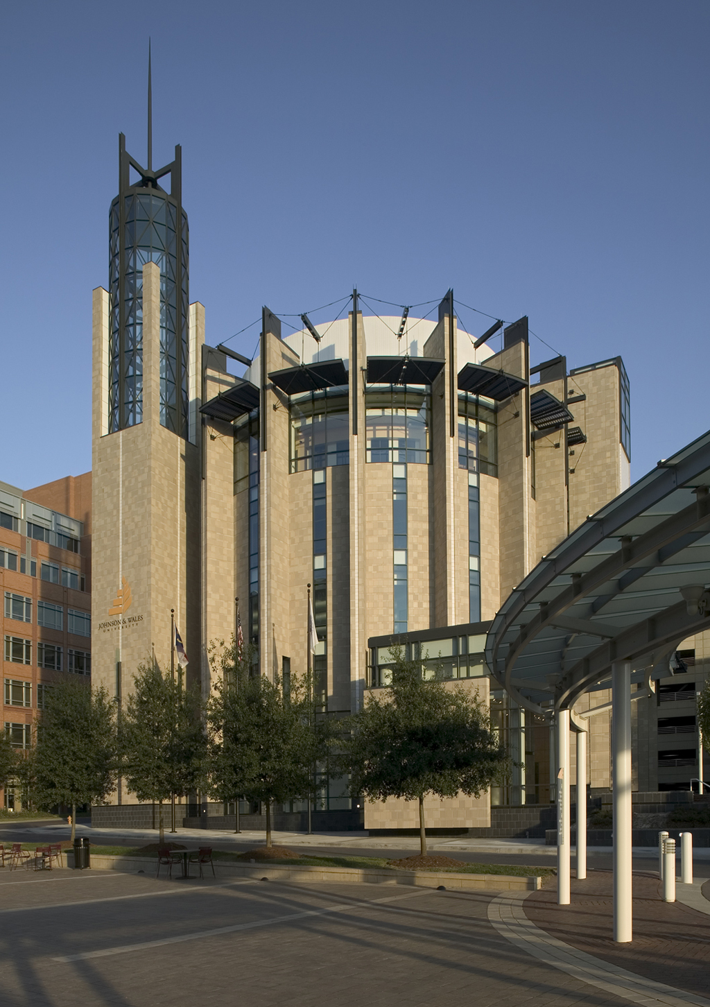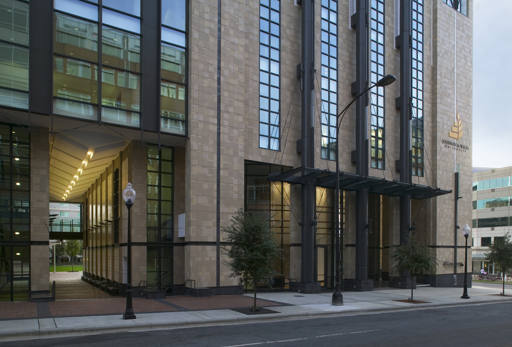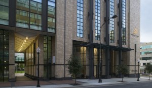 Exterior wall construction includes a masonry veneer and curtain-wall system with a granite veneer at the first floor elevation and granite coping accents at the roof