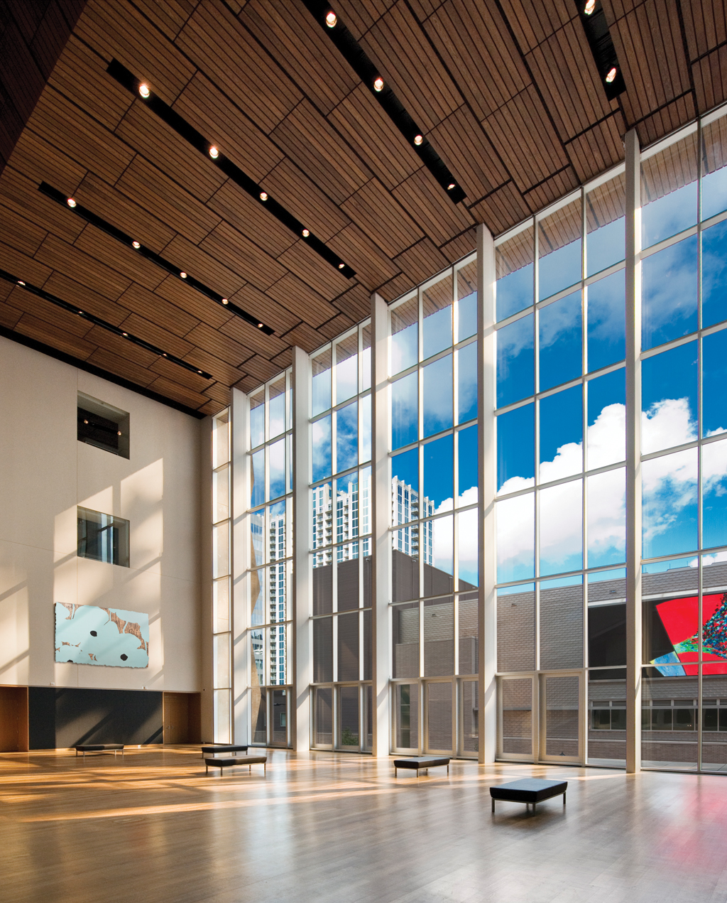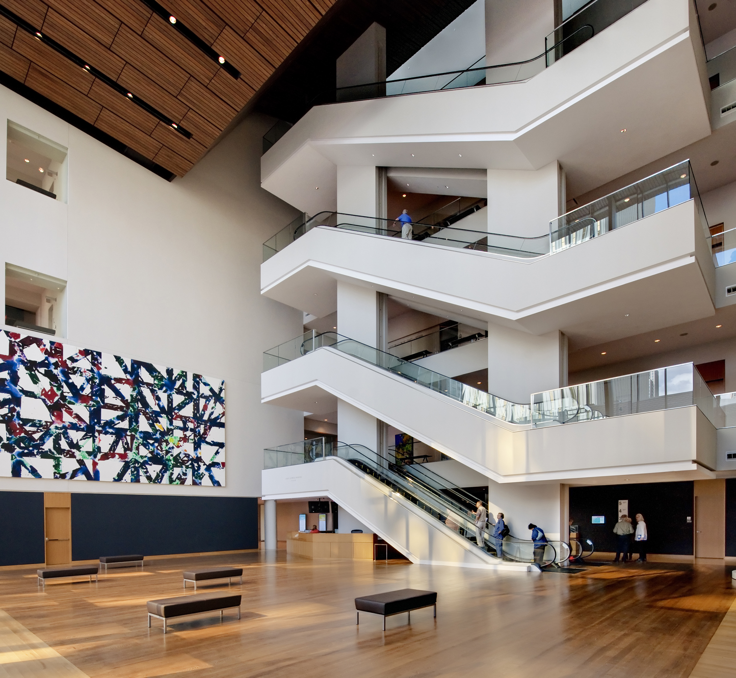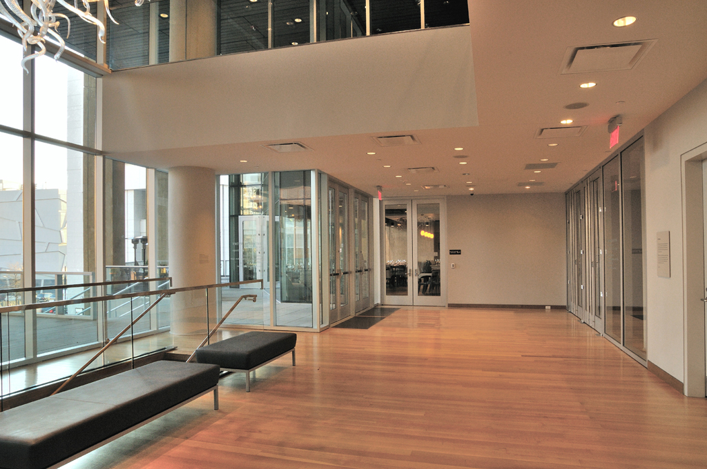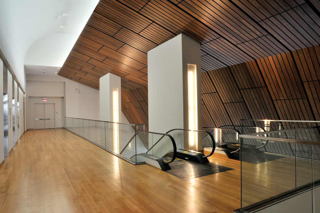 Four passenger elevators, one service elevator and one freight elevator, four levels of stacked escalators, pre-finished wood ceiling, hardwood flooring, a 240-seat auditorium and a museum shop