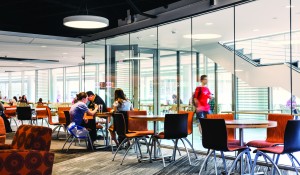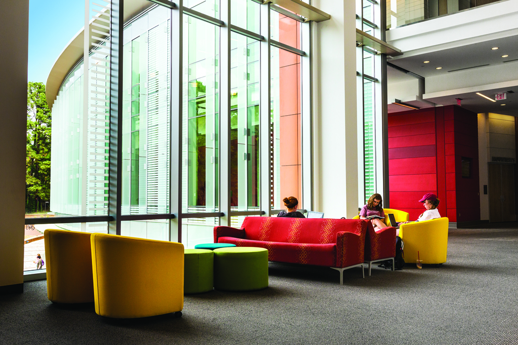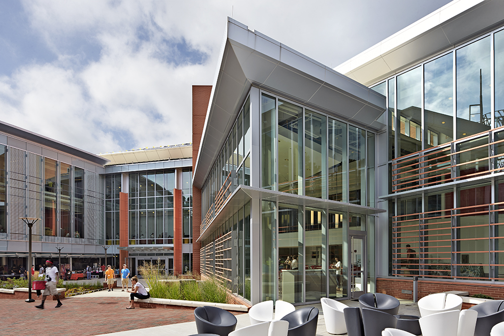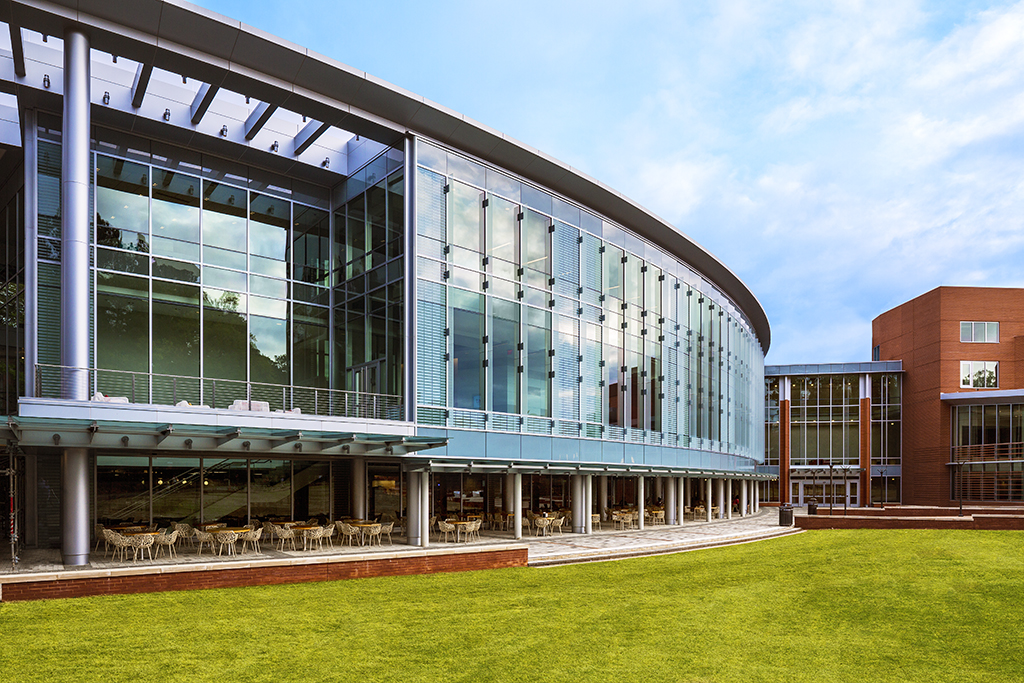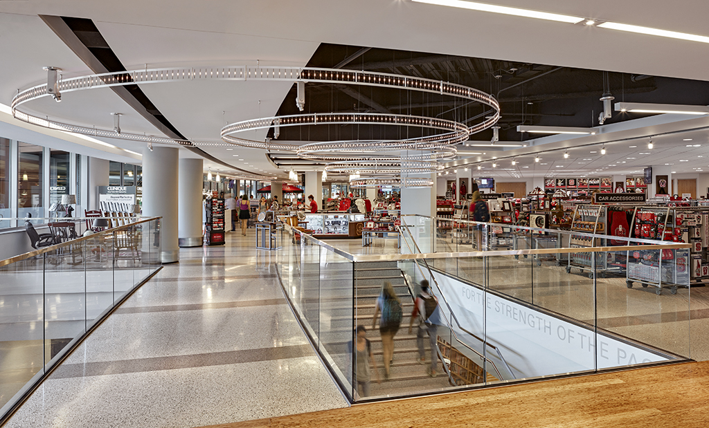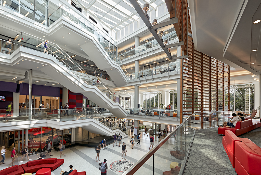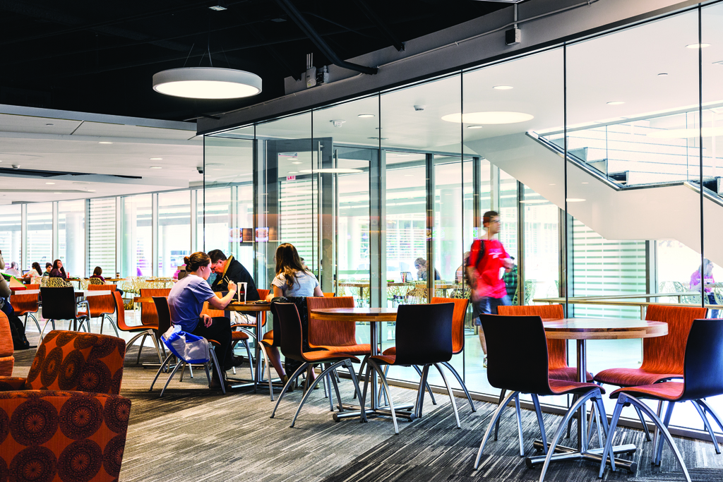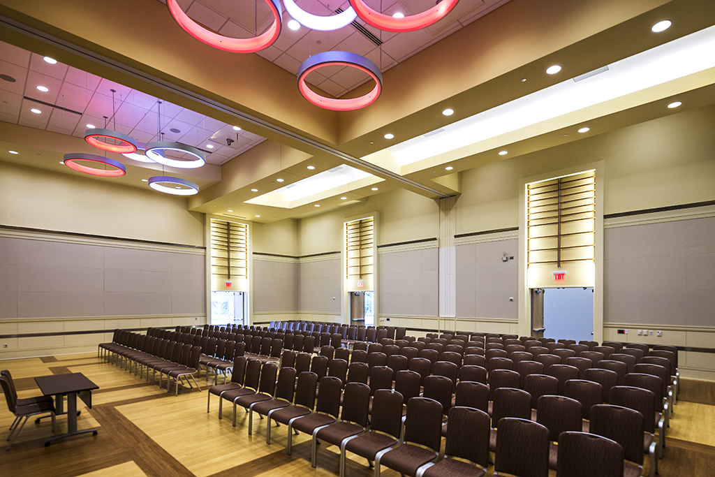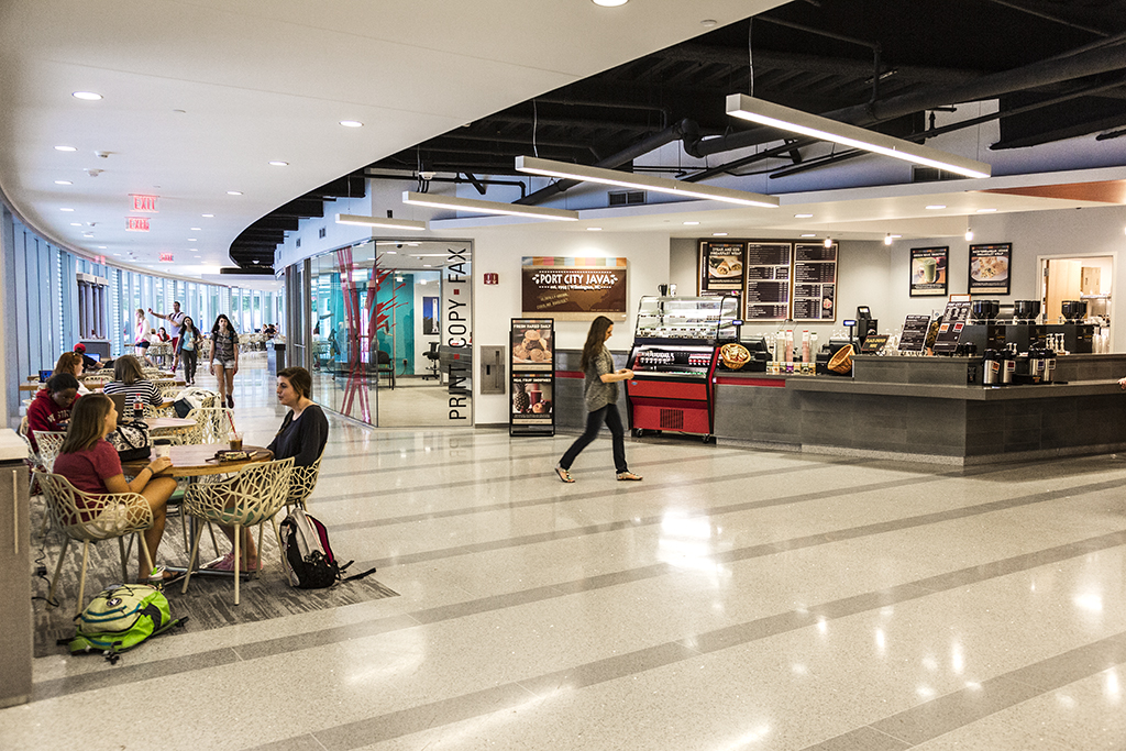 Ballroom for lectures, meetings, and training, multiple food service areas, the Wolves’ Den, a bookstore and offices