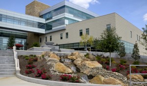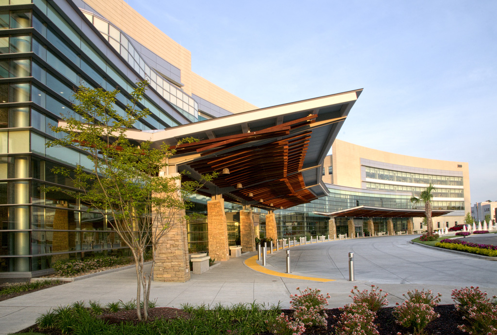 The exterior of the buildings feature metal panels, precast and glass curtain wall with a radiused curve extending the entire length of the hospital’s exterior