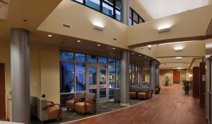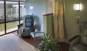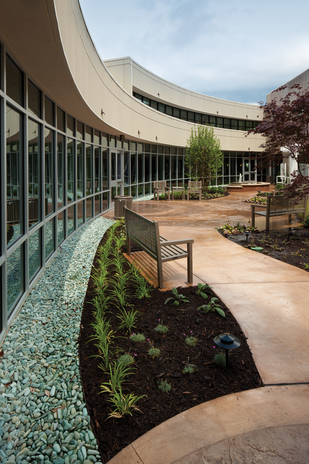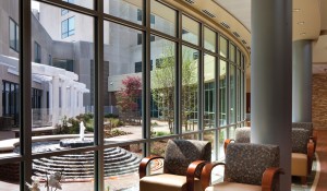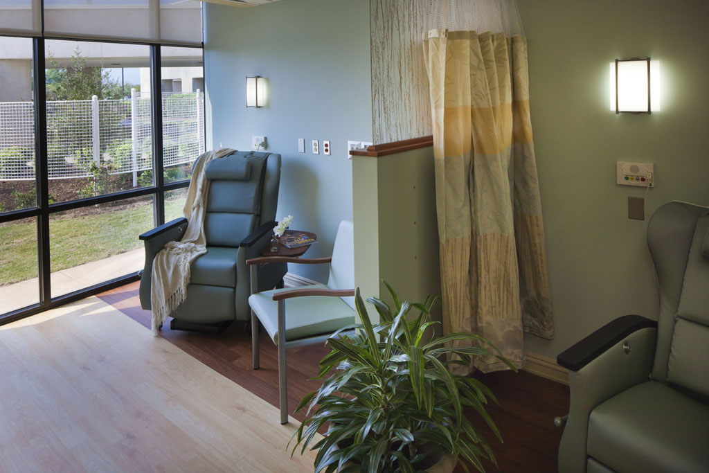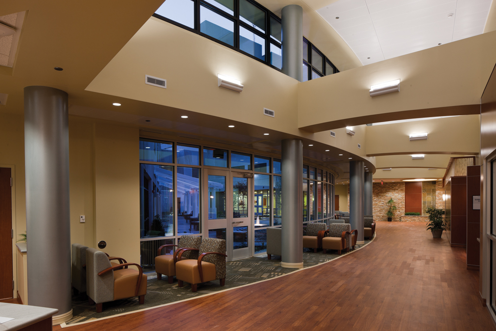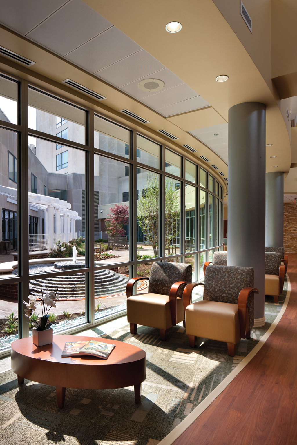 A 150-foot-long glass curtain wall faces the west side of the courtyard and offers patients and guests a tranquil view while seated in the waiting area or in a chemotherapy chair