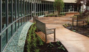 Landscaped courtyard with seating areas and a healing garden with a cascading water fountain