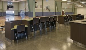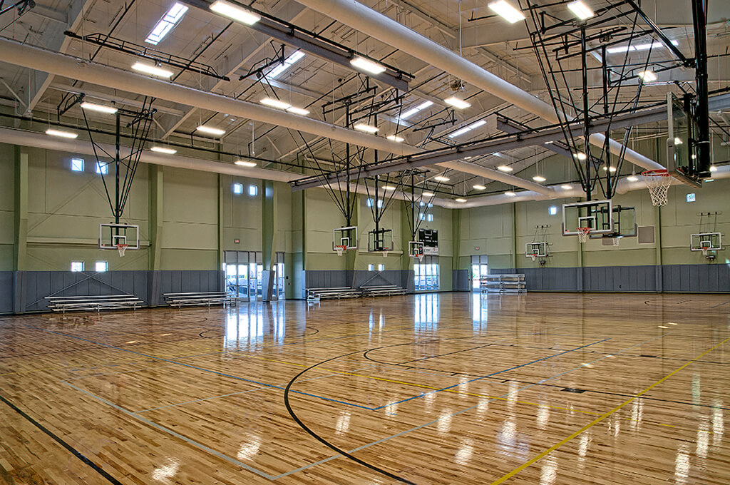 The lower level includes gymnasium space to accommodate two high school-sized basketball courts, or alternatively, four volleyball courts