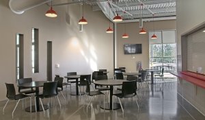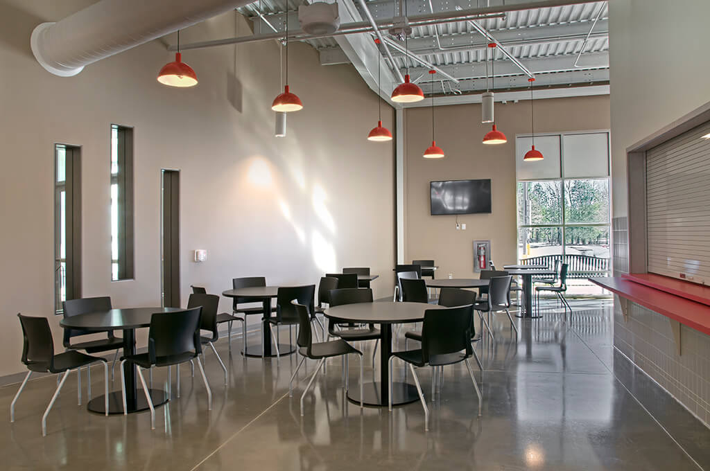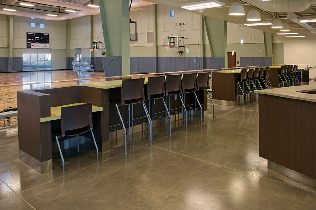 The main level includes multi-purpose rooms, dining and concession areas. Seating and standing room are provided for views to the courts below