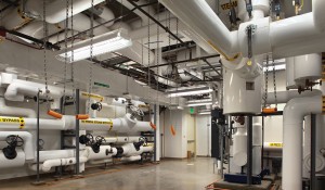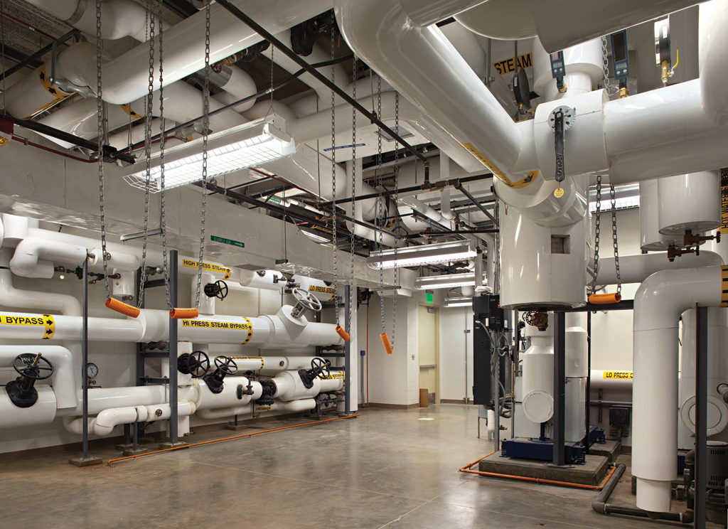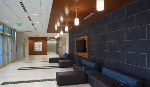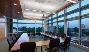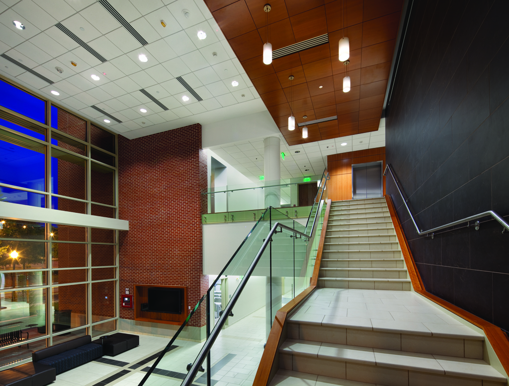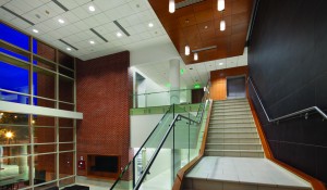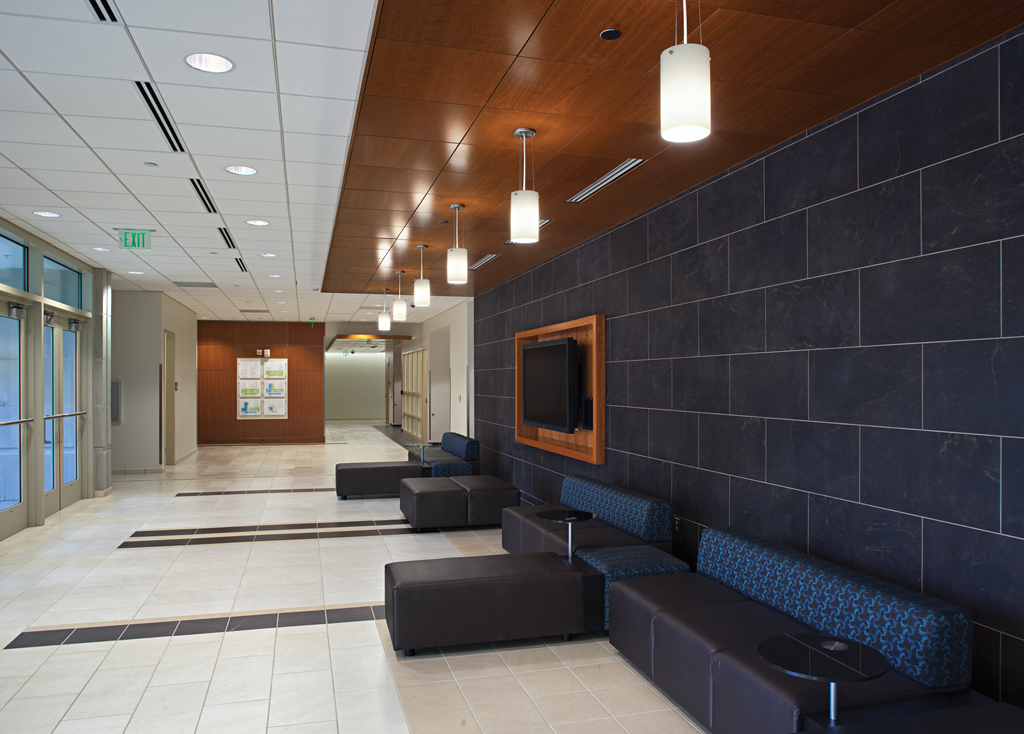 Interior includes wood paneling, glass, carpet, tile, linoleum, and acoustical ceiling panels, as well as efficient temperature controls, occupancy sensor lighting, and low-flow water fixtures