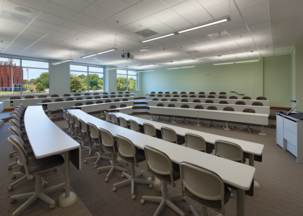 Construction of a steel and concrete, five-story classroom building with a predominantly brick exterior that features CMU block and cast stone, and a glass curtain-wall entryway