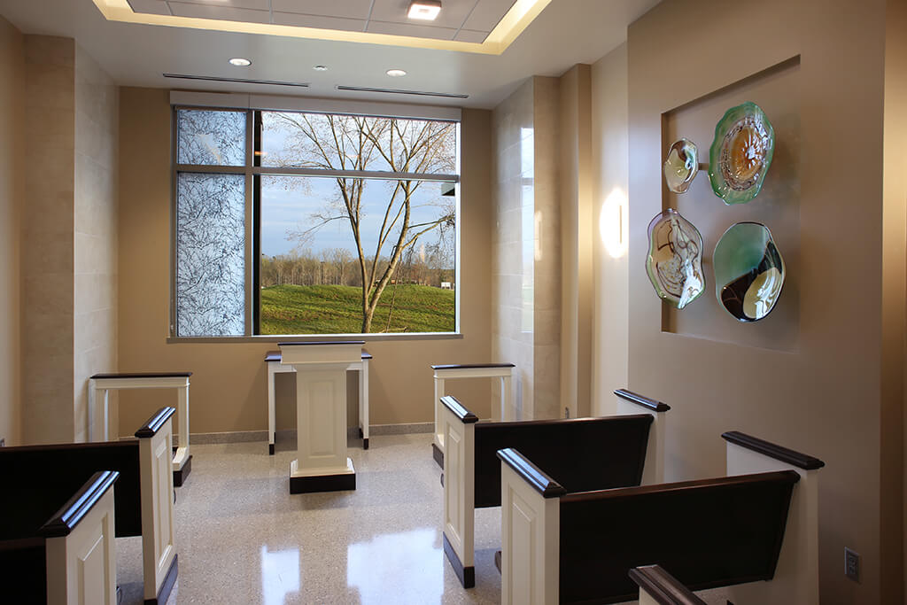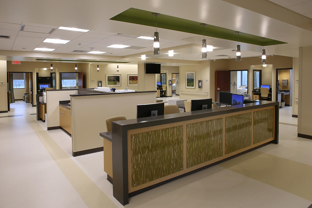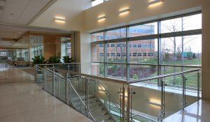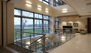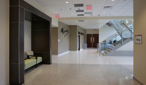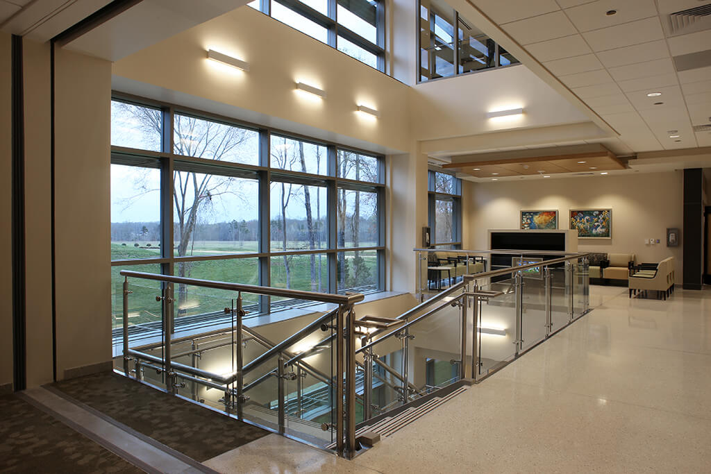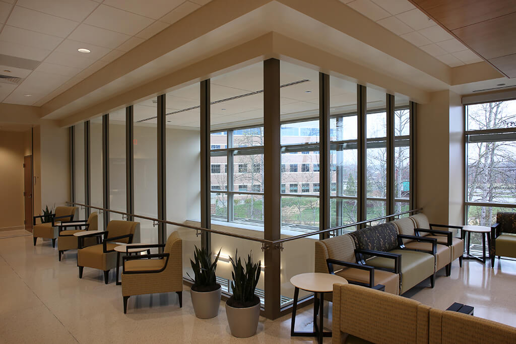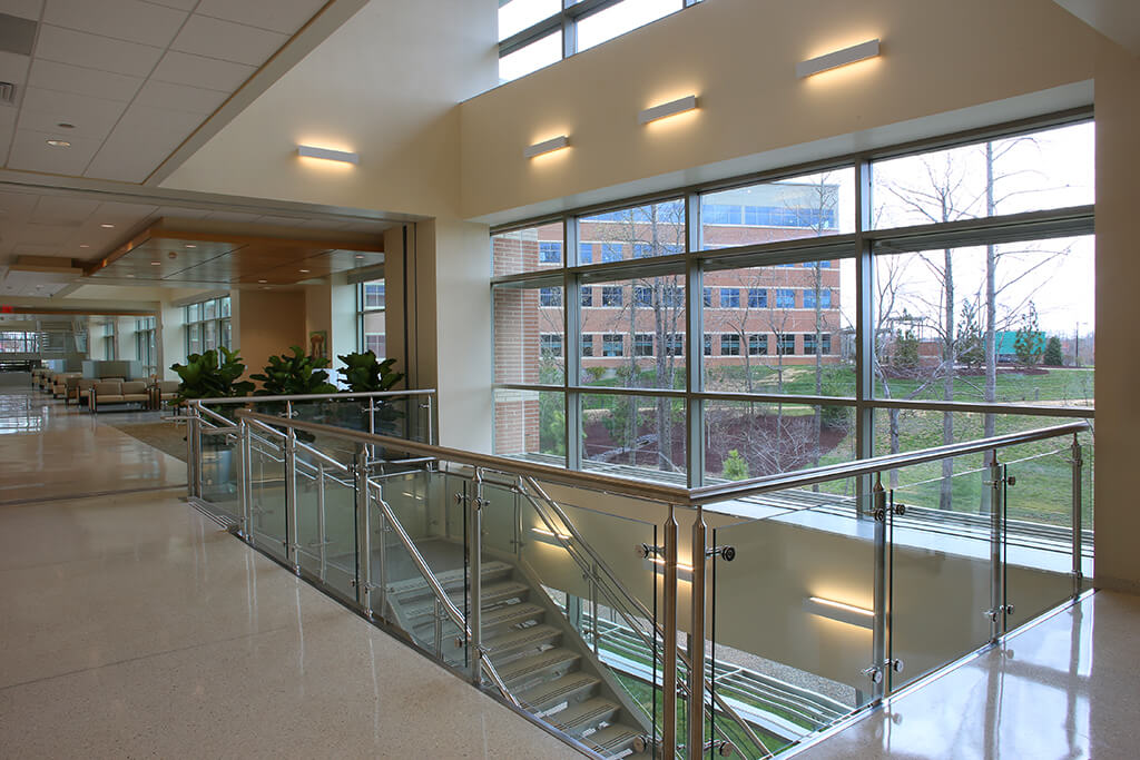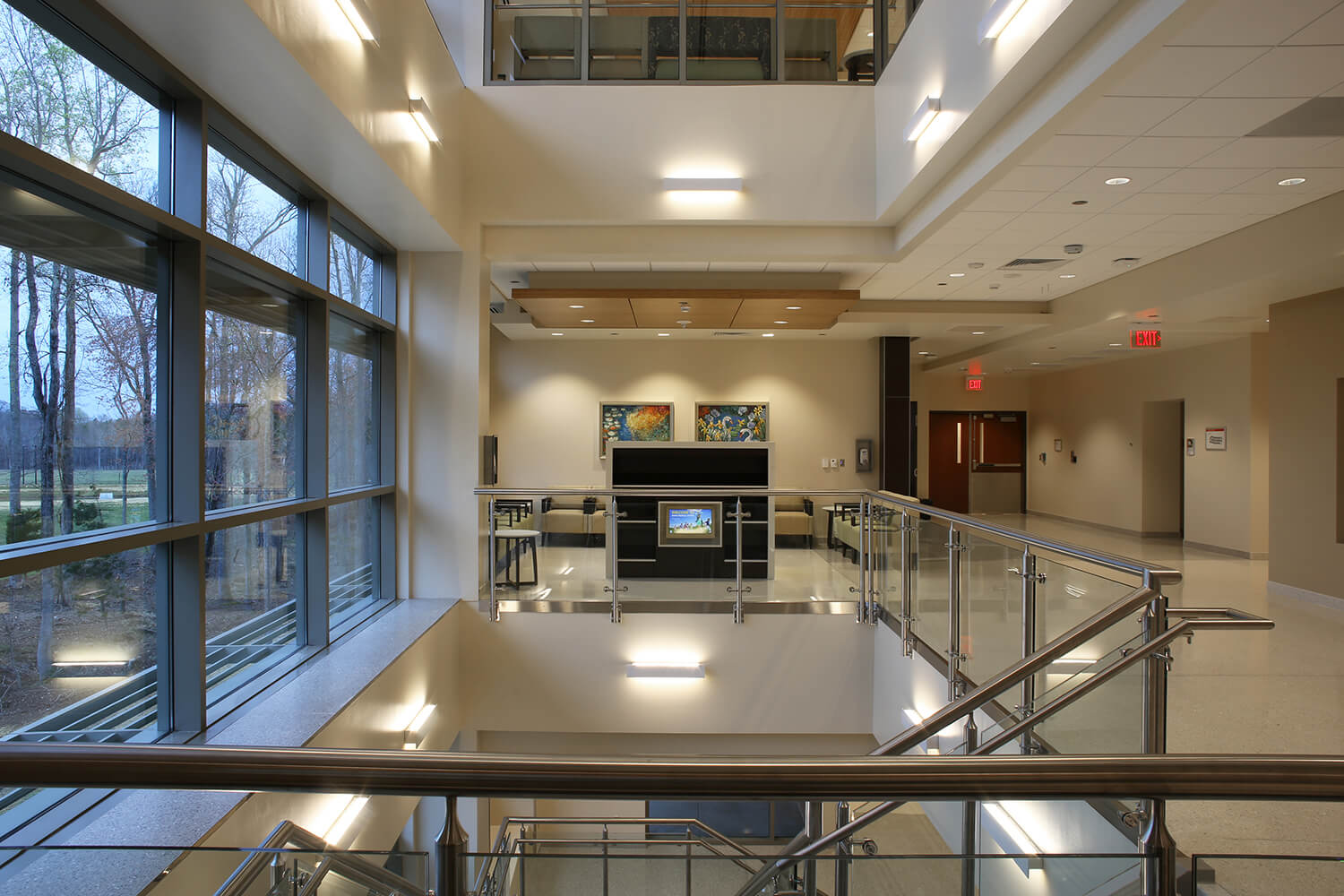 The top two floors are comprised of fifty inpatient beds, patient support spaces, rehabilitation gyms, offices, conference rooms and a pharmacy