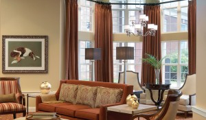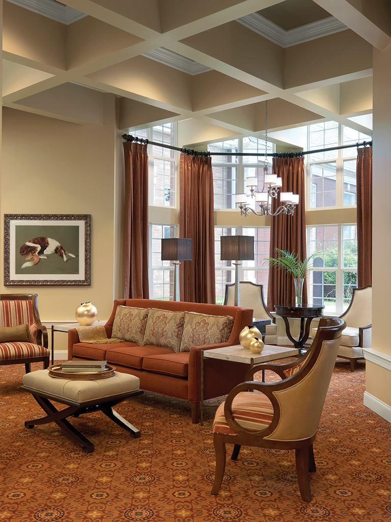 Main entrance with coffered ceilings, an open fireplace, resident mail room and several seating areas